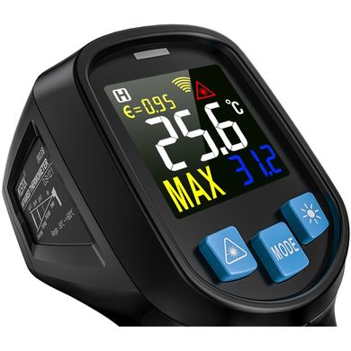 Infračervený bezkontaktný teplomer s rozsahom –50 °C až 600 ℃, rozlíšením 0,1 °C, digitálnym displejom, laserovým zameraním, jednoduchým ovládaním jednou rukou.