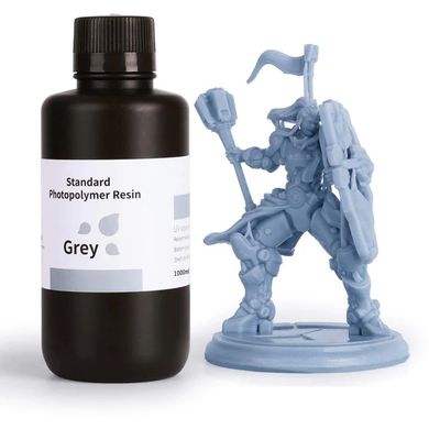Štandardná sivá fotopolymérová živica Elegoo je ideálnym tlačovým materiálom, najmä pre 3D tlačiarne LCD, ktoré na vytvrdzovanie modelov používajú zdroj UV svetla. Aplikácie siahajú od miniatúr stolových hier až po priemyselné diely a komponenty. Možno ju použiť aj na tlač 3D CAD návrhov, ktoré sa od nápadu dostanú až do reality. Je špeciálne navrhnutý na zníženie objemového zmrštenia počas procesu vytvrdzovania svetlom, čo zaručuje veľmi presné vytlačené modely s hladkým povrchom. Živica je navrhnutá tak, aby výrazne skrátila čas tlače vďaka svojej vynikajúcej tekutosti. Zároveň jej vynikajúca stabilita a primeraná tvrdosť zaručujú bezproblémovú a úspešnú tlač. Vďaka obsahu vysokokvalitných pigmentov a fotoiniciátorov vytvárajú modely vytlačené živicou mimoriadne živé a ohromujúce farebné efekty, takmer ako umelecké dielo. Vlnová dĺžka vytvrdzovania je štandardných 405 nm. Výrobok sa dodáva vo fľaši obsahujúcej 1 kg živice.