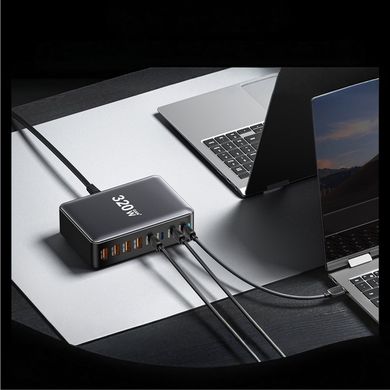 320W stolová nabíjačka GaN Essager s 8 portami (4×USB-C, 4×USB-A) na súčasné nabíjanie notebookov, tabletov a telefónov. PD 3.0, QC 4.0, ochranné funkcie.