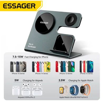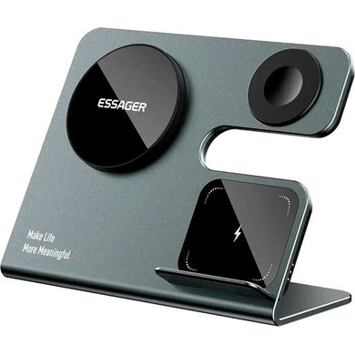 Essager OJD-119 bezdrôtová nabíjačka 3 v 1 pre telefón 15 W, slúchadlá 3 W a hodinky 3 W, štandard QI, LED indikácia, hliníková zliatina, napájanie USB-C.