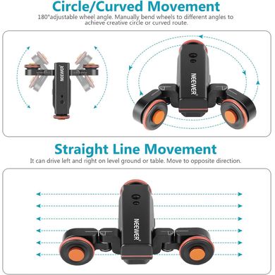 Elektrický kamerový vozík Neewer DL100 je dokonalým nástrojom nasnímanie časozberných, nízkoúhlových a panoramatických videí. Pomocou bezdrôtového diaľkového ovládania môžete nastaviť3 úrovne rýchlosti (1,4 cm/s, 2,4 cm/s, 3 cm/s), meniť smery a ovládať pohyb až do vzdialenosti 6 metrov. Dve kolieska s nastavením uhla 90° umožňujú pohyb vozíka po kruhových alebo lineárnych dráhach. Obojstranná skrutka 1/4" až 3/8" jekompatibilná s takmer každou videohlavou, guľovou hlavou a držiakom na telefón. Vozík spolupracuje aj s posuvníkmi kamery na dosiahnutie efektu priblíženia.
