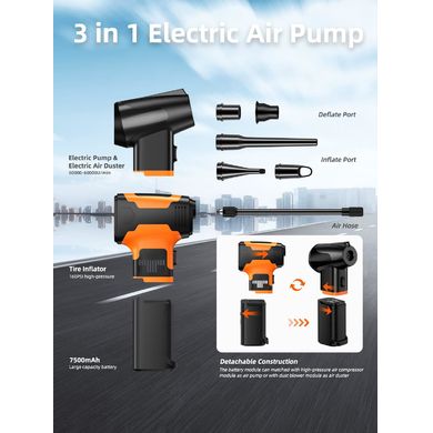 Mobilný kompresor možno v okamihu premeniť na vysávač vzduchu, stačí vymeniť hlavu. Vďaka tomu je možné ľahko odstrániť nečistoty z miest, ktoré by boli s bežnou handrovou prachovkouťažko dostupné. Vzduchovú prachovku oceníte pričistení interiéru auta alebo napríklad priodstraňovaní omrviniek z klávesnice. Na jeseň vám pomôže so spadnutým lístím na vašom aute.
