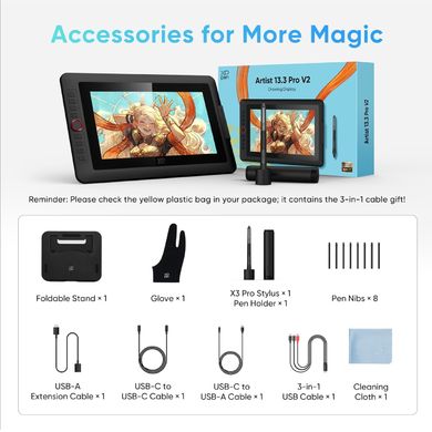 Rozlíšenie snímacej vrstvy 5080 lpi zaručuje mimoriadne presné snímanie pohybu pera s minimálnou granularitou, porovnateľné s drahšími profesionálnymi grafickými tabletmi. Dodávaný nastaviteľný stojan AC42 má rozmery 266,3 × 222,9 mm a poskytuje stabilnú základňu pre tablety s veľkosťou do 33,78 cm.Konštrukcia stojana využíva robustnú hliníkovú zliatinu s protišmykovými silikónovými podložkami, ktoré zabezpečujú stabilitu na rôznych povrchoch a chránia tablet pred poškriabaním. Mechanizmus nastavenia uhla až do 90 stupňov využíva hladké trecie kĺby, ktoré umožňujú presné nastavenie pracovného uhla a jeho spoľahlivé udržanie aj pri intenzívnom používaní stylusu. Vylepšené vetranie zabezpečuje účinný odvod tepla, čo je dôležité pre zachovanie optimálneho výkonu pri intenzívnom používaní, najmä pri práci s náročnými aplikáciami, ako je 3D renderovanie alebo strih videa. Balenie okrem stojana obsahuje osem náhradných hrotov stylusu v rôznych úrovniach tvrdosti, ktoré sa prispôsobia rôznym štýlom kreslenia, špeciálnu kresliacu rukavicu s vodivými končekmi prstov pre viacdotykové gestá, elegantný držiak pera s integrovaným úložiskom náhradných hrotov a kompletnú kabeláž vrátane kábla HDMI 3 v 1 a plne funkčného kábla USB-C s podporou režimu DisplayPort Alt.