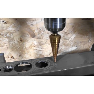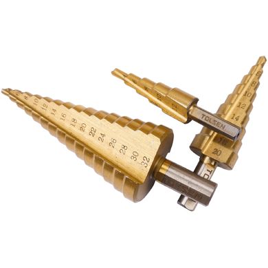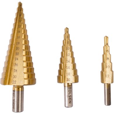 Sada 3 stupňovitých vrtákov, materiál rýchlorezná oceľ, kalené, s titánovým povlakom, pre priemery 2 – 32 mm, kufrík na uloženie vrtákov