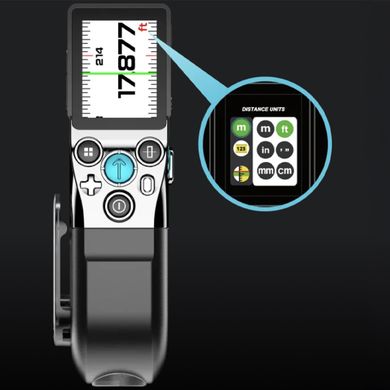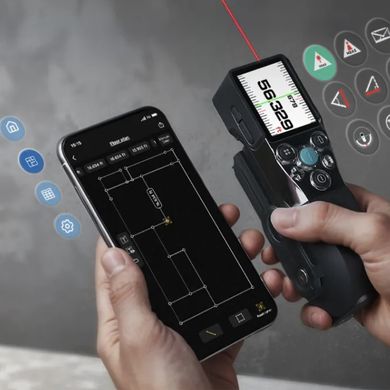 Laserový merač vzdialenosti a plochy, mobilná aplikácia, dosah 100 m, prehľadný displej, nabíjací konektor USB-C, možnosť pripnutia na opasok